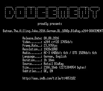 | FiLENAME: | Batman.The.Killing.Joke.2016.German.DL.1080p.BluRay.x264-DOUCEMENT.mkv |