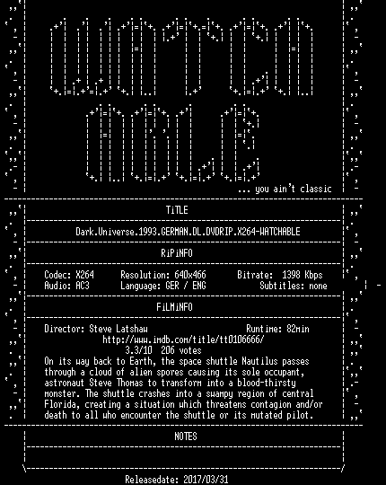 | FiLENAME: | Dark.Universe.1993.GERMAN.DL.DVDRIP.X264-WATCHABLE.mkv |