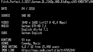 | FiLENAME: | Pitch.Perfect.3.2017.German.DL.2160p.UHD.BluRay.x265-ENDSTATiON.mkv |