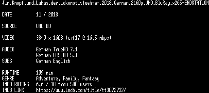 | FiLENAME: | Jim.Knopf.und.Lukas.der.Lokomotivfuehrer.2018.German.2160p.UHD.BluRay.x265-ENDSTATiON.mkv |
