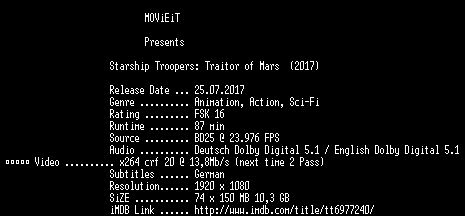 | FiLENAME: | Starship.Troopers.Traitor.of.Mars.2017.German.DL.1080p.BluRay.x264-MOViEiT.mkv |