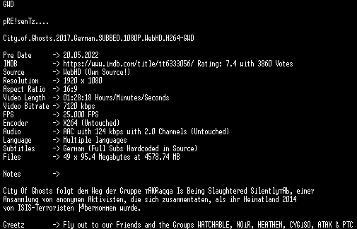 | FiLENAME: | City.of.Ghosts.2017.German.SUBBED.DOKU.1080P.WebHD.H264-GWD.mkv |