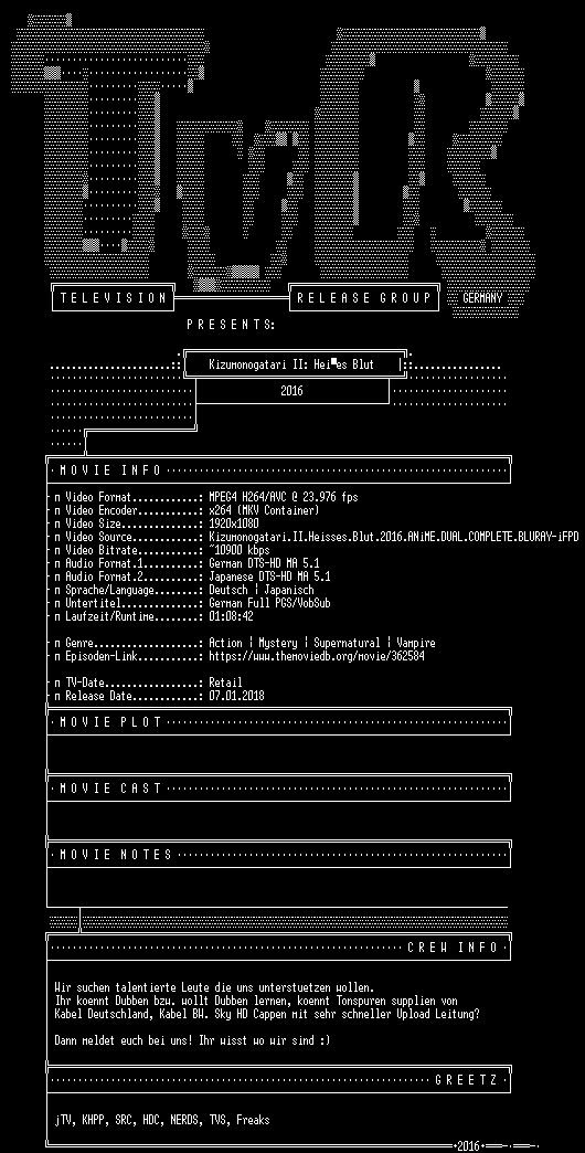 | FiLENAME: | Kizumonogatari.II.Heisses.Blut.2016.GERMAN.5.1.DL.DTSMA.ANiME.BDRiP.1080p.WS.x264-TvR.mkv |
