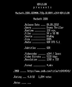 | FiLENAME: | Macbeth (2006) [GER-dts 720p BD].mkv |
