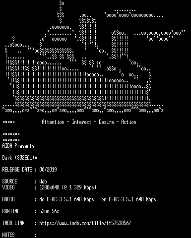 | FiLENAME: | Dark.S02E01.German.DL.720p.WebHD.x264-AIDA.mkv |