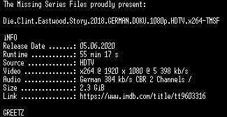 | FiLENAME: | Die.Clint.Eastwood.Story.2018.GERMAN.DOKU.1080p.HDTV.x264-TMSF.mkv |