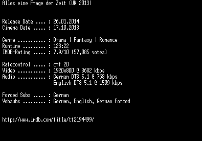 | FiLENAME: | Alles.eine.Frage.der.Zeit.German.DL.1080p.BluRay.x264-EXQUiSiTE.mkv |