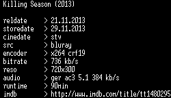 | FiLENAME: | Killing.Season.2013.German.BDRip.x264-CONTRiBUTiON.mkv |