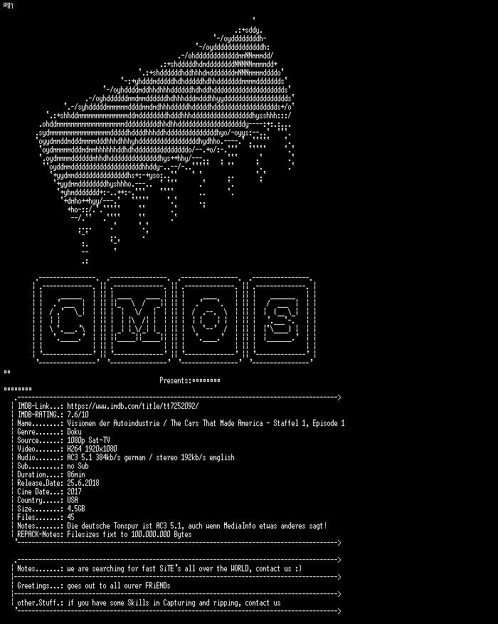 | FiLENAME: | Visionaere.der.Autoindustrie.S01E01.DOKU.GERMAN.DL.1080p.HDTV.x264.REPACK-CMOS.mkv |