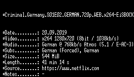 | FiLENAME: | Criminal.Germany.S01E02.GERMAN.720p.WEB.x264-EiSBOCK.mkv |
