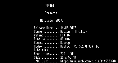| FiLENAME: | Altitude.2015.German.AC3.BDRip.x264-MOViEiT.mkv |