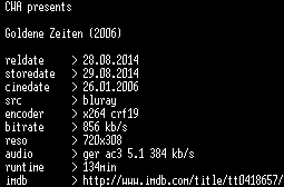 | FiLENAME: | Goldene.Zeiten.2006.German.BDRip.x264.iNTERNAL-CWA.mkv |