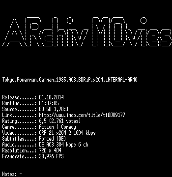 | FiLENAME: | Tokyo.Powerman.German.1985.AC3.BDRiP.x264.iNTERNAL-ARMO.mkv |