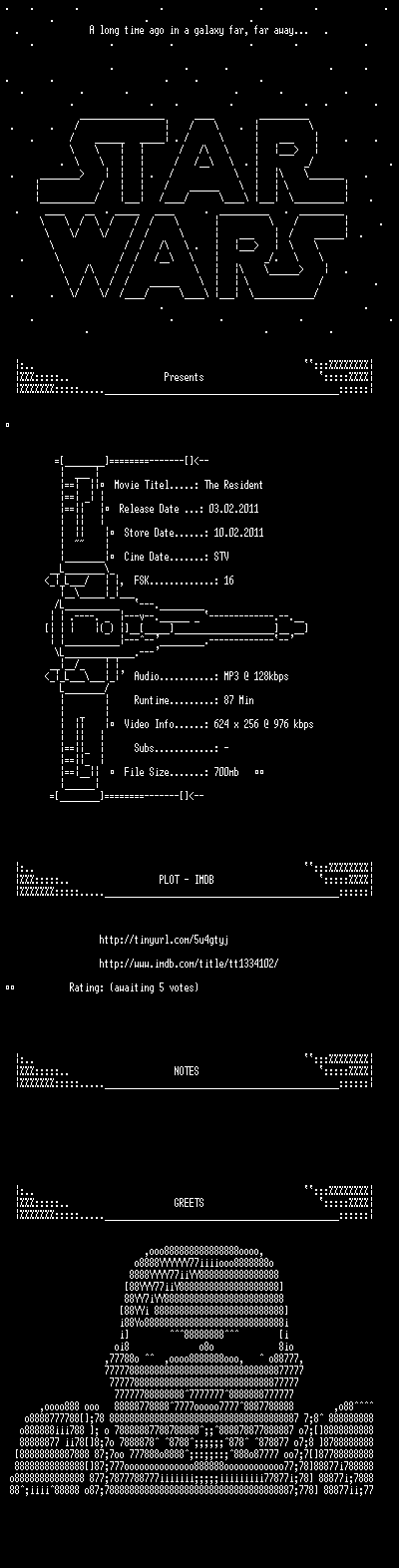 | FiLENAME: | The.Resident.German.2011.DVDRip.XViD-StarWars.avi |
