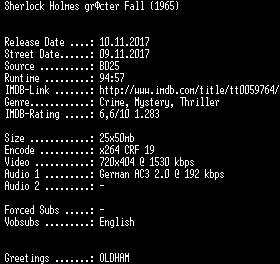 | FiLENAME: | Sherlock.Holmes.groesster.Fall.German.REMASTERED.1965.AC3.BDRip.x264-SPiCY.mkv |