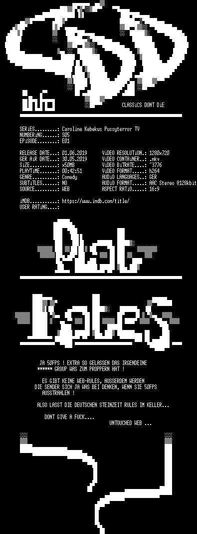 | FiLENAME: | Carolin.Kebekus.PussyTerror.TV.S05E01.GERMAN.720p.WEB.h264-CDD.mkv |