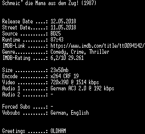| FiLENAME: | Schmeiss.die.Mama.aus.dem.Zug.German.REMASTERED.1987.AC3.BDRip.x264-SPiCY.mkv |