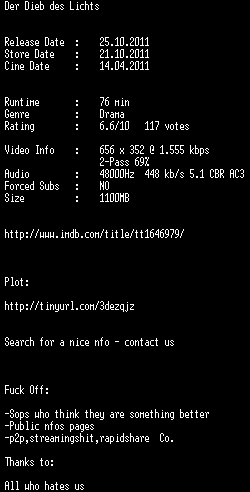 | FiLENAME: | Der.Dieb.des.Lichts.German.AC3.DVDRip.XviD-DiSTRiCT.avi |