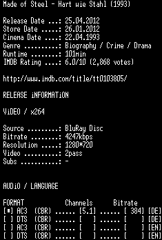 | FiLENAME: | Made.of.Steel.Hart.wie.Stahl.1993.German.720p.BluRay.x264-OBLiGATED.mkv |