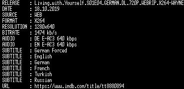| FiLENAME: | Living.with.Yourself.S01E04.GERMAN.DL.720P.WEBRIP.X264-WAYNE.mkv |
