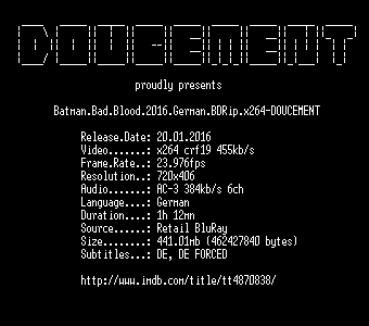 | FiLENAME: | Batman.Bad.Blood.2016.German.BDRip.x264-DOUCEMENT.mkv |