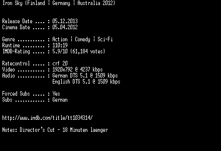 | FiLENAME: | Iron.Sky.DC.German.DL.1080p.BluRay.x264-EXQUiSiTE.mkv |