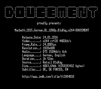 | FiLENAME: | Macbeth.2015.German.DL.1080p.BluRay.x264-DOUCEMENT.mkv |