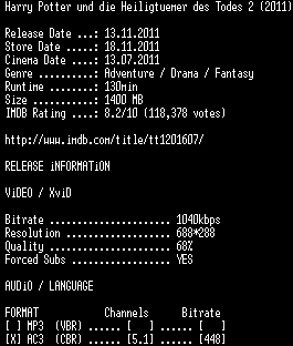 | FiLENAME: | Harry.Potter.und.die.Heiligtuemer.des.Todes.Teil.2.German.2011.AC3.BDRip.XviD-OBLiGATED.avi |