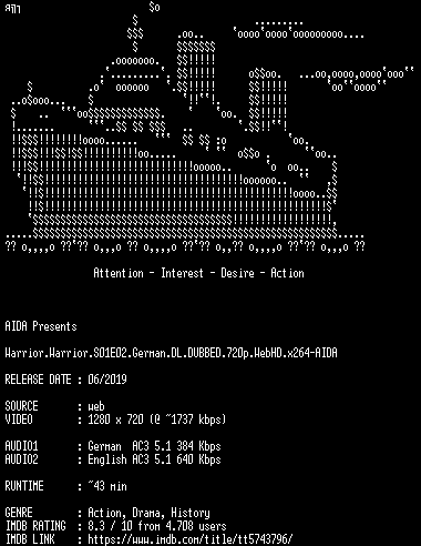 | FiLENAME: | Warrior.S01E02.German.DL.DUBBED.720p.WebHD.x264-AIDA.mkv |