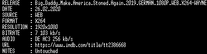 | FiLENAME: | Big.Daddy.Make.America.Stoned.Again.2019.GERMAN.1080P.WEB.X264-WAYNE.mkv |