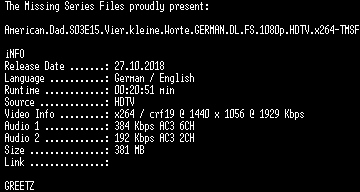 | FiLENAME: | American.Dad.S03E15.Vier.kleine.Worte.GERMAN.DL.FS.1080p.HDTV.x264-TMSF.mkv |