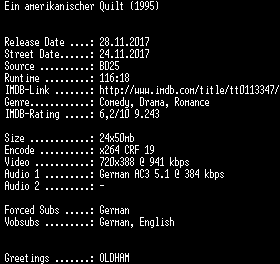 | FiLENAME: | Ein.amerikanischer.Quilt.German.REMASTERED.1995.AC3.BDRip.x264-SPiCY.mkv |