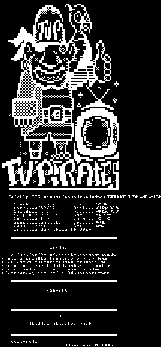 | FiLENAME: | The.Good.Fight.S03E07.Hier.stuerzen.Diane.und.Liz.die.Demokratie.GERMAN.DUBBED.DL.720p.WebHD.x264-TVP.mkv |