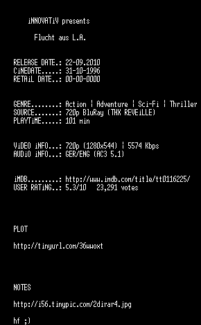 | FiLENAME: | John Carpenters Flucht aus LA (1996) [DL 720p BD].mkv |