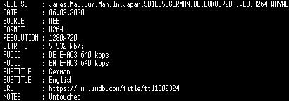 | FiLENAME: | James.May.Our.Man.In.Japan.S01E05.GERMAN.DL.DOKU.720P.WEB.H264-WAYNE.mkv |