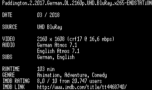 | FiLENAME: | Paddington.2.2017.German.DL.2160p.UHD.BluRay.x265-ENDSTATiON.mkv |