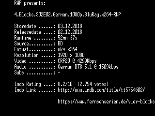 | FiLENAME: | 4.Blocks.S02E02.German.1080p.BluRay.x264-RWP.mkv |