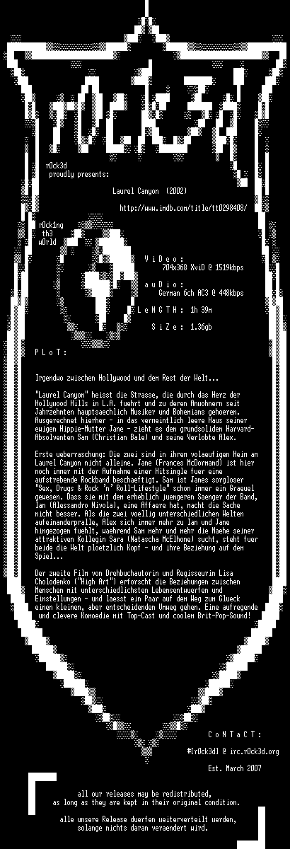 | FiLENAME: | Laurel Canyon (2002) [GER-AC3 WS DVD] CD1.avi |