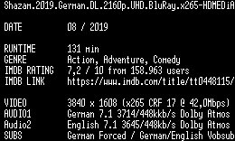 | FiLENAME: | Shazam.2019.German.DL.2160p.UHD.BluRay.x265-HDMEDiA.mkv |