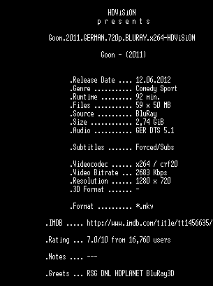 | FiLENAME: | Goon.2011.GERMAN.720p.BLURAY.x264-HDViSiON.mkv |