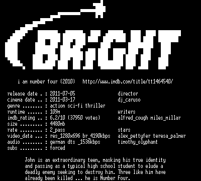 | FiLENAME: | Ich.bin.Nummer.Vier.German.720p.BluRay.x264-BRiGHT.mkv |