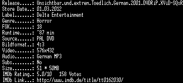 | FiLENAME: | Unsichtbar.und.extrem.Toedlich.German.2001.DVDRiP.XViD-SQsR.avi |