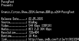 | FiLENAME: | Gramis.Circus.Show.2014.German.BDRip.x264-PussyFoot.mkv |