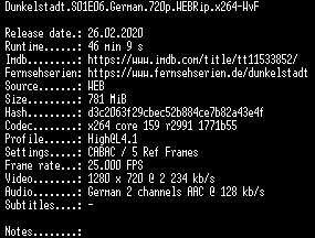 | FiLENAME: | Dunkelstadt.S01E06.German.720p.WEBRip.x264-WvF.mkv |