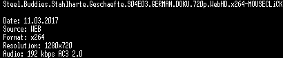 | FiLENAME: | Steel.Buddies.Stahlharte.Geschaefte.S04E03.GERMAN.DOKU.720p.WebHD.x264-MOUSECLiCK.mkv |