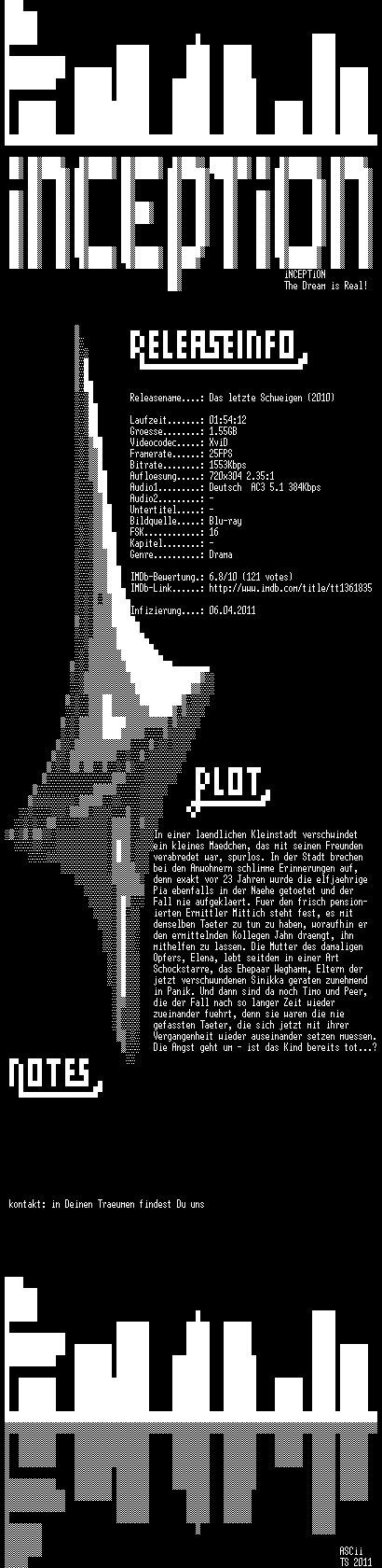 | FiLENAME: | Das.letzte.Schweigen.2010.German.AC3.BDRip.XviD-iNCEPTiON.avi |