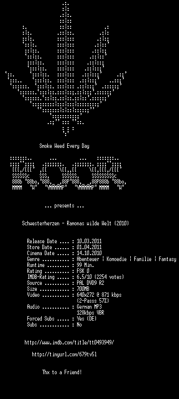 | FiLENAME: | Schwesterherzen.Ramonas.wilde.Welt.GERMAN.2010.DVDRiP.XViD-ROOR.avi |