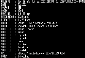 | FiLENAME: | Die.Strafe.Gottes.2022.GERMAN.DL.1080P.WEB.X264-WAYNE.mkv |