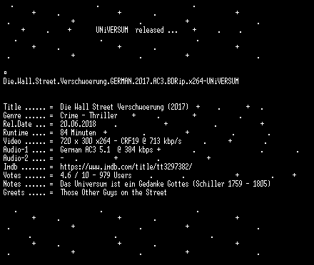 | FiLENAME: | Die.Wall.Street.Verschwoerung.GERMAN.2017.AC3.BDRip.x264-UNiVERSUM.mkv |
