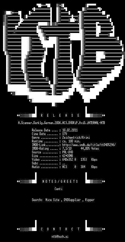 | FiLENAME: | A.Scanner.Darkly.German.2006.AC3.DVDRiP.XviD.iNTERNAL-NTB.avi |